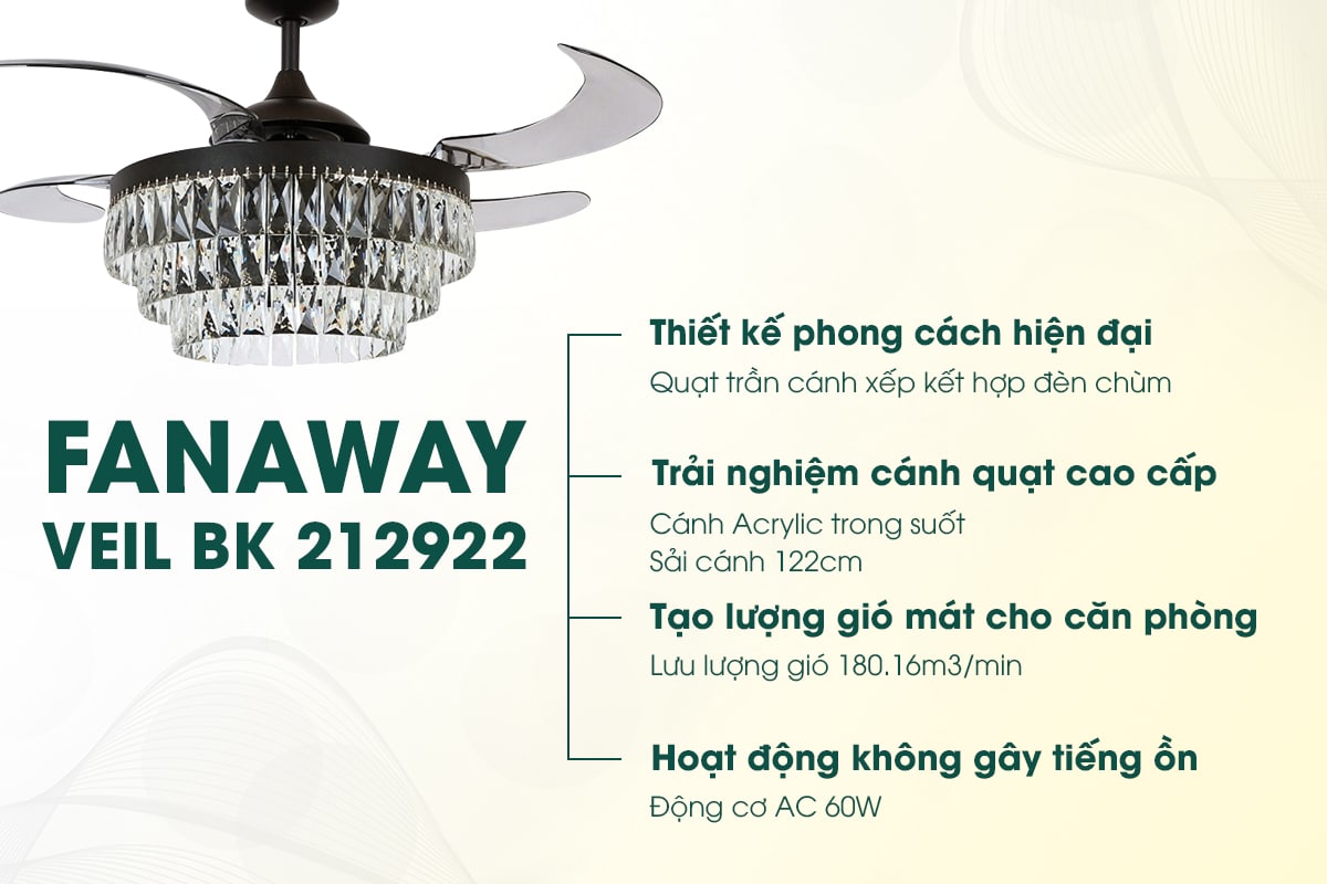 Fanaway Veil là mẫu quạt trần cao cấp đến từ thương hiệu Úc Fanaway, nổi bật với thiết kế đẹp mắt như chiếc đèn chùm lộng lẫy. Mỗi chi tiết đều thể hiện phong cách hiện đại, đem lại vẻ đẹp nghệ thuật cho không gian sống. Fanaway Veil chính là lựa chọn hàng đầu cho những ai muốn tạo điểm nhấn nổi bật, mang dấu ấn cá nhân vào ngôi nhà.