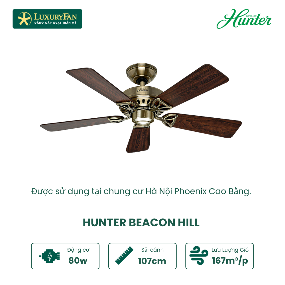 Quạt trần Hunter Beacon Hill là mẫu quạt trần 5 cánh được lấy cảm hứng từ vẻ đẹp kiến trúc đồi Beacon (Mỹ), mang đậm đường nét thiết kế tinh xảo, lộng lẫy. Đồi Beacon Hill thành phố Boston Mỹ nổi tiếng với kiến trúc độc đáo, được tạo nên từ những dãy nhà kiểu liên bang, san sát tường gạch đỏ. Xen kẽ những con đường hẹp, có độ dốc nhất định, đầy cây xanh và những dãy cột đèn đường kiểu cách.