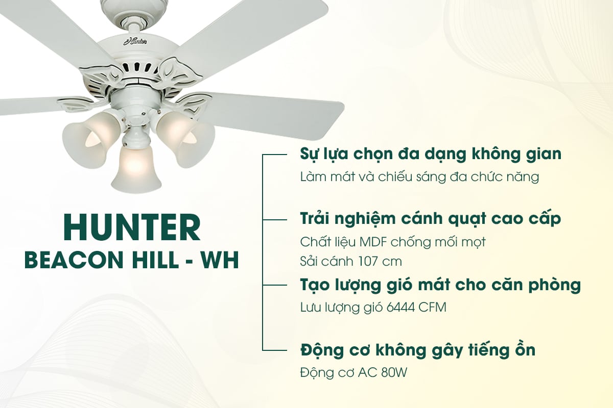 Không chỉ thu hút bởi vẻ bề ngoài lộng lẫy, kiêu sa mà quạt trần Hunter Beacon Hill còn chứng minh được năng lực thực sự chiếm hữu lòng tin của khách hàng nhờ vào hàng loạt những tiểu tiết cấu thành như: Động cơ quạt, sự êm ái khi vận hành, chất liệu và chiều dài đặc biệt của sải cánh, chức năng hiện đại đi kèm,…