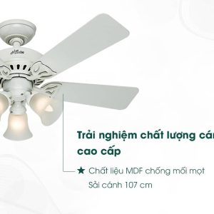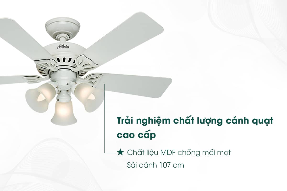Quạt trần Hunter Beacon Hill có sải cánh chiều dài 107cm giúp tối ưu không gian, mang đến lượng gió nhẹ nhàng tỏa đều khắp không gian. Cánh quạt được làm từ gỗ MDF với ưu điểm nổi bật là khả năng chống mối mọt, chống bám bụi, chịu lực tốt và bền màu sơn.