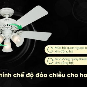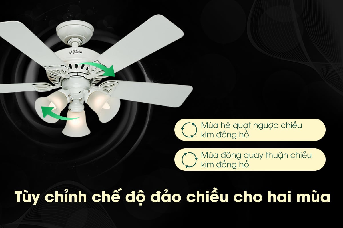 Đặc biệt, quạt trần được trang bị chế độ đảo chiều gió cho nên không gian sống nhà bạn lúc nào cũng lý tưởng. Mùa hè Hunter Beacon Hill quay ngược chiều kim đồng hồ, quạt sẽ hút khí nóng lên trên đẩy gió mát xuống. Mùa đông quay thuận chều kim đồng hồ, hút khí lạnh lên trên đẩy khí ấm xuống làm thoáng không gian.