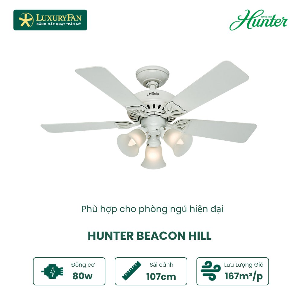 Nhu cầu sử dụng quạt trần của người dân đang tăng cao khi quạt trần hiện nay có thể tích hợp chức năng 3 trong 1: Làm mát, chiếu sáng, trang trí. Hunter Beacon Hill là lựa chọn tuyệt vời cho không gian phòng ngủ hay các không gian diện tích nhỏ. Liên hệ ngay Hotline hoặc fanpage LuxuryFan để được tư vấn và hỗ trợ mua hàng, lắp đặt quạt trần Hunter Beacon Hill tại nhà an toàn, đảm bảo tiêu chuẩn và tiết kiệm chi phí nhất.