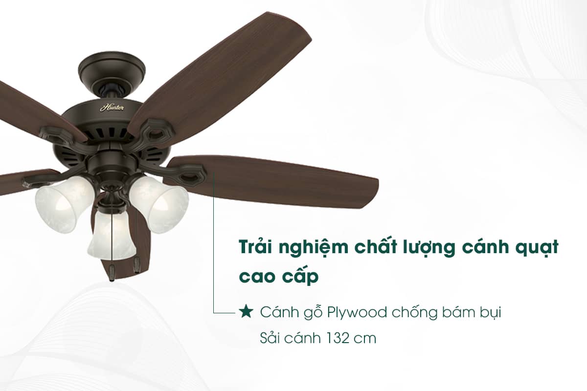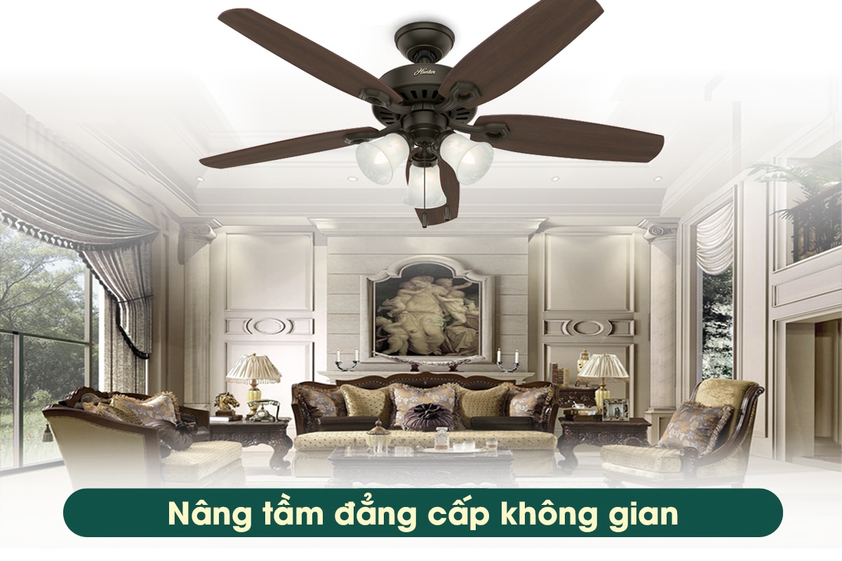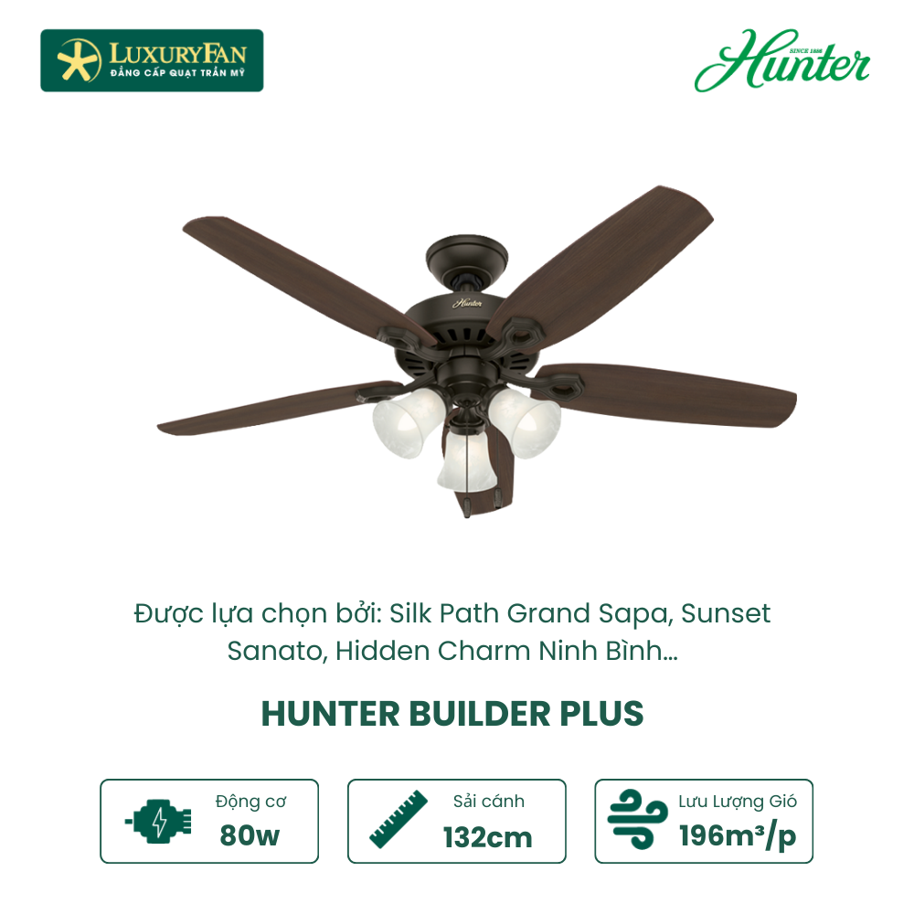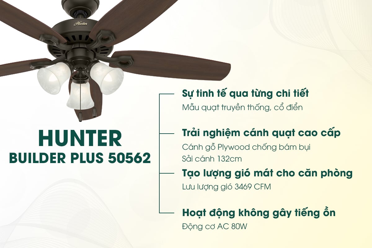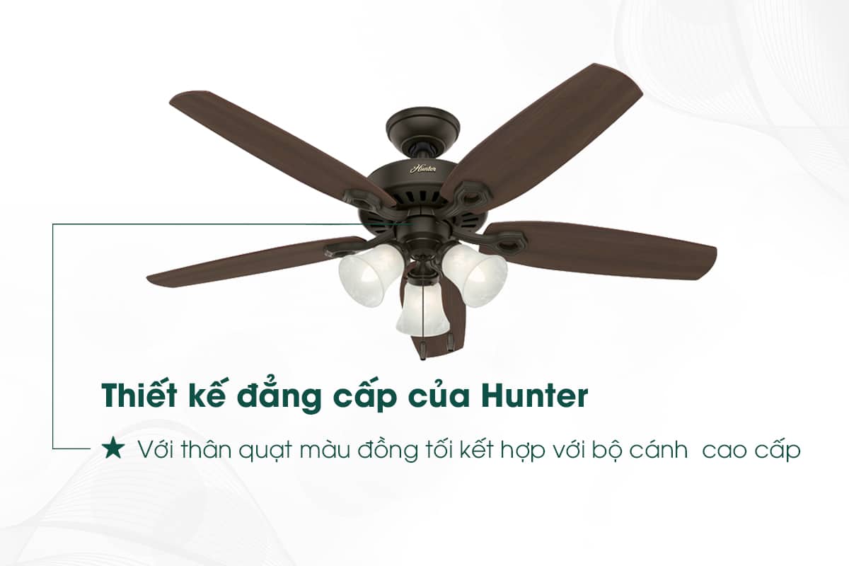 Đối với những không gian sống mang đậm phong cách cổ điển, Hunter Builder Plus được coi như là một mảnh ghép không thể thiếu giúp kiến tạo sự đẳng cấp. Sở hữu thiết kế cổ điển tỉ mỉ, động cơ Whisperwind độc quyền của Hunter không gây tiếng ồn tạo gió 189,6 m3/phút, sải cánh 132cm và tích hợp đèn chiếu sáng, Hunter Builder Plus sẽ là điểm nhấn ấn tượng cho không gian sống.