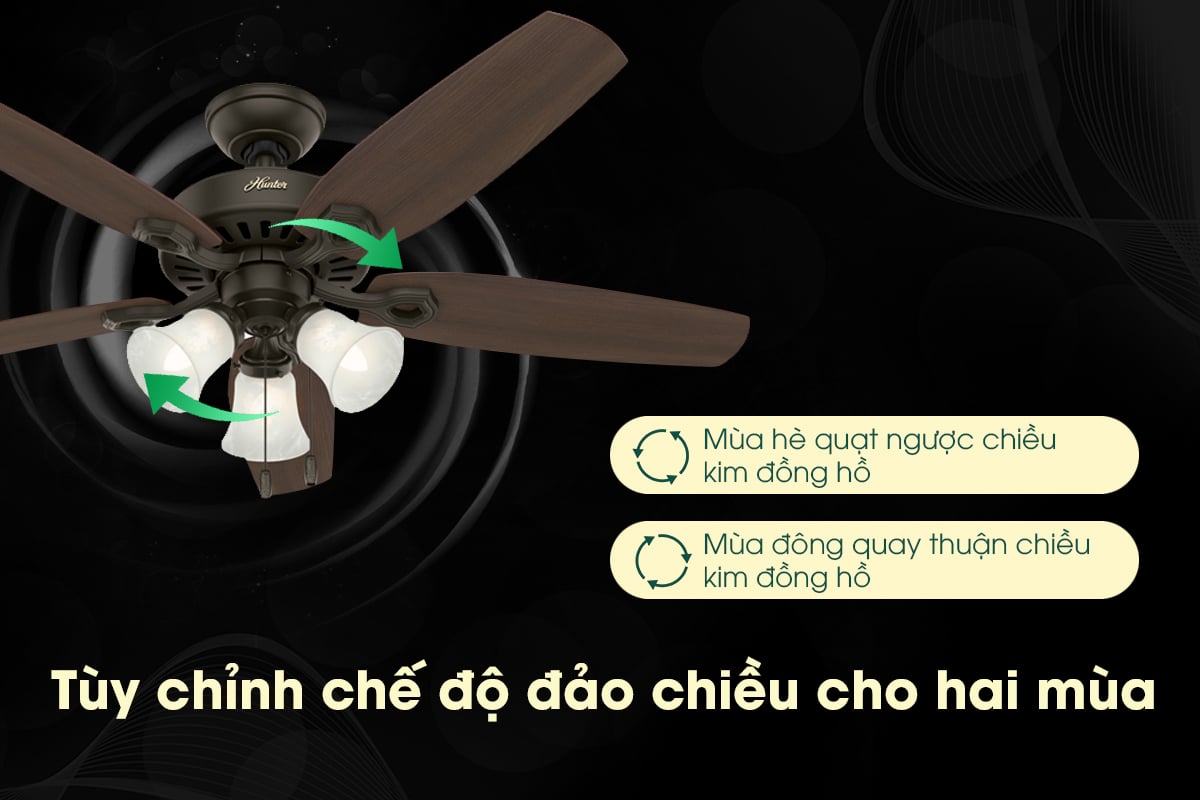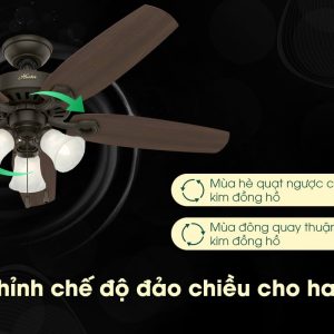 Tính năng đảo chiều gió linh hoạt được ứng dụng hầu hết ở các sản phẩm quạt trần đèn của thương hiệu Hunter. Sản phẩm được ứng dụng tính này sẽ có khả năng tạo luồng gió mát vào mùa hè giúp không khí trong phòng thoáng đãng mát mẻ hơn. Còn vào mùa đông quạt sẽ lưu thông, đẩy luồng khí ấm từ trần nhà xuống để căn phòng thoáng mà không lạnh.