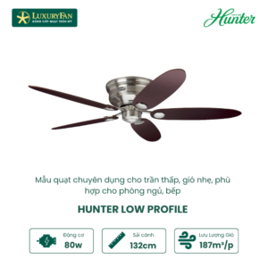 Trong thời đại ngày nay, xu hướng thiết kế nội thất dần hướng tới sự đơn giản, tinh tế và hiện đại. Đặc biệt, với những không gian trần thấp, việc lựa chọn một chiếc quạt trần phù hợp càng trở nên quan trọng hơn bao giờ hết. Quạt trần Hunter Low Profile ra đời để đáp ứng hoàn hảo nhu cầu này. Với thiết kế mỏng, thon gọn và tinh tế, quạt hoàn toàn phù hợp cho các không gian trần thấp mà vẫn đảm bảo vẻ đẹp và sự sang trọng.