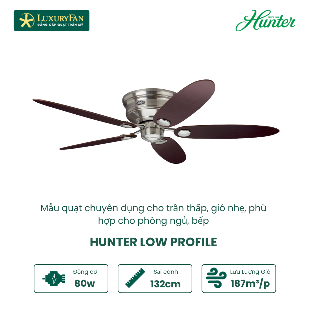 Với thiết kế đẹp mắt và khả năng làm mát tuyệt vời, Hunter Low Profile phù hợp cho nhiều loại hình không gian khác nhau như phòng ngủ, phòng khách hay các căn hộ chung cư, nhà phố. Đặc biệt, sản phẩm này đã được sử dụng tại các khu nghỉ dưỡng sang trọng như Intercontinental Hồ Tràm và hệ thống trường học Vinschools.