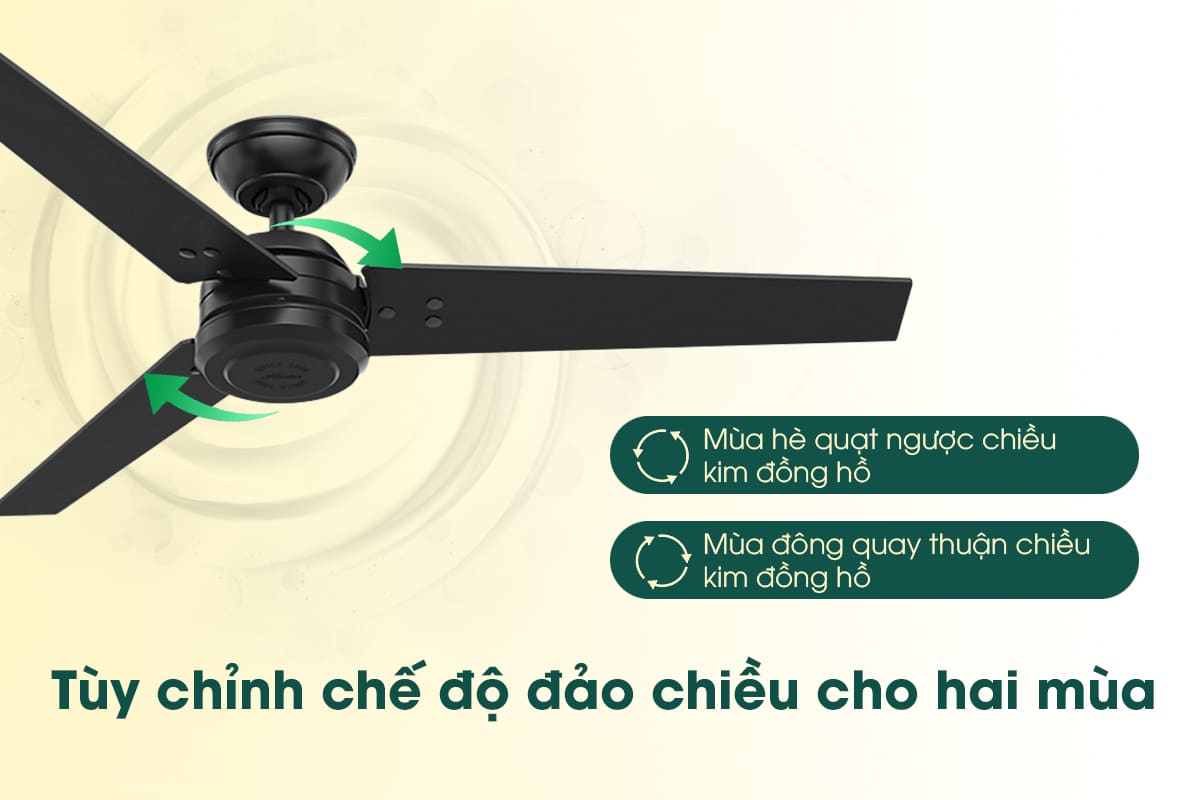 Một trong những tính năng nổi bật của Hunter Protos chính là chức năng đảo chiều gió thông minh. Nhờ vào công nghệ tiên tiến, quạt có thể tự động đảo ngược chiều quay, giúp phân phối đều không khí trong toàn bộ không gian. Chế độ đảo chiều gió giúp tối ưu hóa luồng không khí, đảm bảo không khí mát lạnh được lan tỏa khắp mọi ngóc ngách, loại bỏ hoàn toàn những điểm tĩnh khí. Đồng thời, nó cũng giúp tăng cường luồng khí lưu thông, làm thoáng mà không bị lạnh, tạo ra một môi trường trong lành và thoáng mát hơn trong những ngày nồm ẩm hay mùa lạnh.
