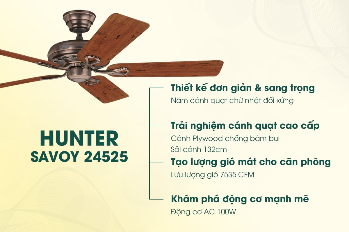 Hunter Savoy là mẫu quạt gió khá mát, đặc biệt êm ái và có tính ổn định, độ bền cao, thích hợp với không gian phòng khách hay phòng ngủ từ 15-20m2.