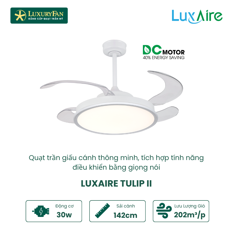 Sự xuất hiện của chiếc quạt trần LuxAire Tulip II sẽ khiến cho không gian nhà bạn trở nên thật ấn tượng. Nếu muốn sở hữu chiếc quạt trần này hãy liên hệ với Luxuryfan để được tư vấn.