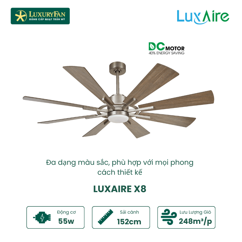 Với những ưu điểm vượt trội và thiết kế ấn tượng, LuxAire X8 là sự lựa chọn hoàn hảo cho nhiều không gian khác nhau. LuxAire X8 sẽ là tâm điểm cuốn hút với thiết kế 8 cánh uy nghi và hiệu suất làm mát tuyệt hảo, biến không gian thành khu nghỉ dưỡng thoải mái giữa lòng đô thị. Lưu lượng gió lớn của LuxAire X8 giúp dễ dàng làm mát không gian rộng tại các ngôi nhà phố hay căn hộ chung cư. Thiết kế ấn tượng cùng chất liệu cánh gỗ đẳng cấp sẽ tạo điểm nhấn nổi bật, mang đến không khí thư giãn.