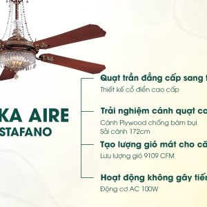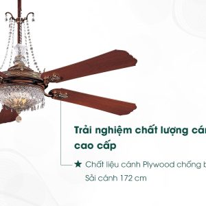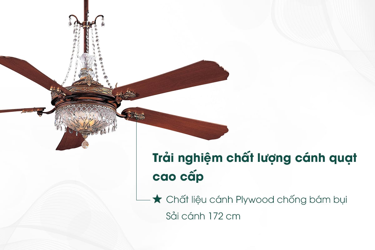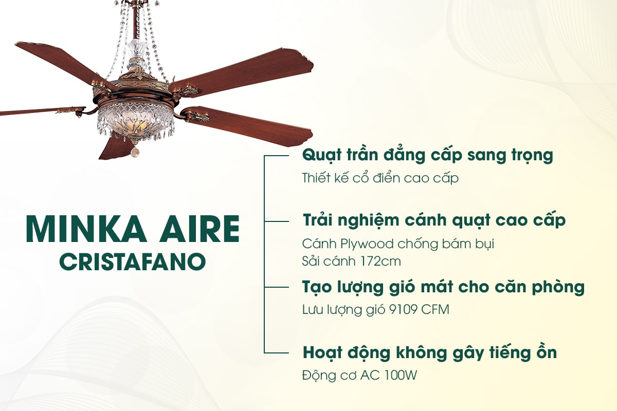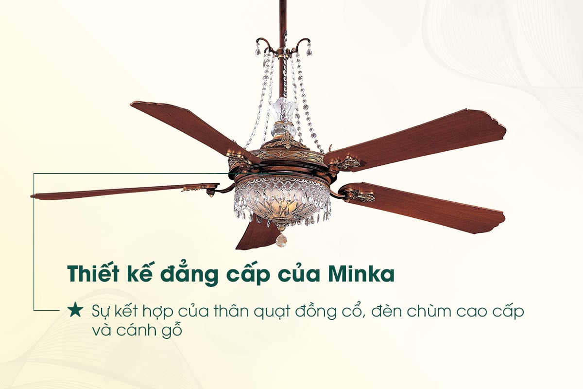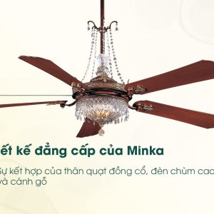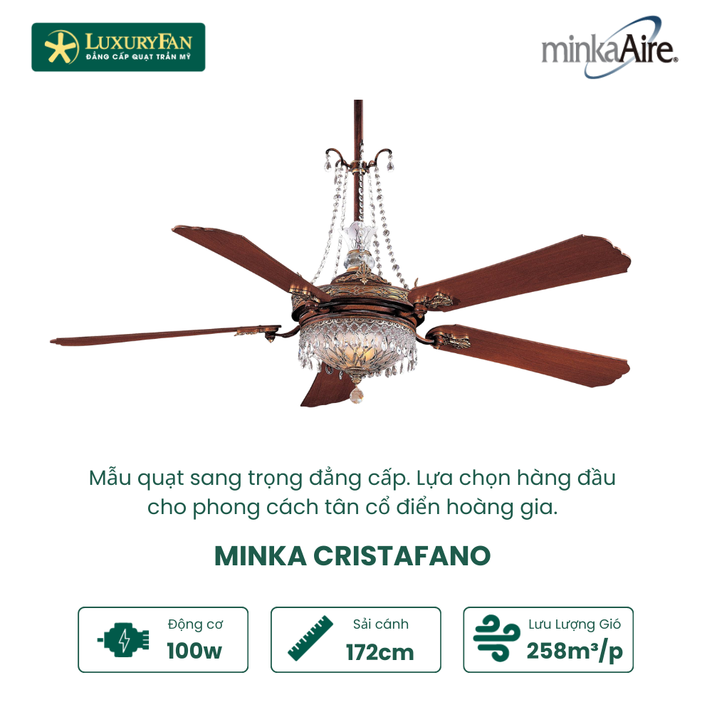 Minka Cristafano là lựa chọn hàng đầu cho phong cách tân cổ điển hoàng gia. 5 cánh gỗ Plywood, sải cánh 172 cm, thích hợp không gian phòng khách nhà phố, biệt thự, lâu đài. Động cơ AC Motor 100W, tạo gió mạnh mẽ, tích hợp đèn chùm pha lê, điều khiển từ xa tiện dụng.