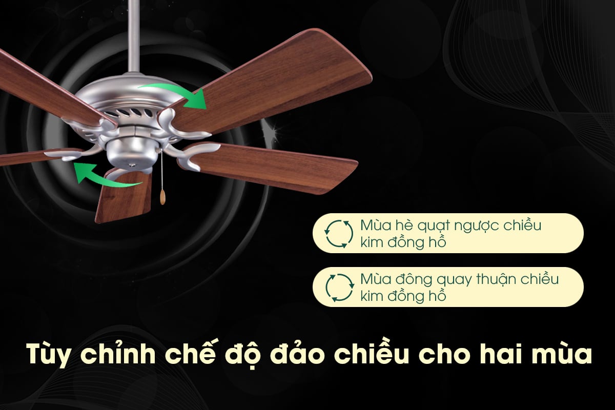 Chế độ đảo chiều gió là một tính năng độc đáo của quạt trần Minka Supra 44. Nhờ tính năng này, quạt có thể phân phối không khí đều khắp không gian, giúp làm mát hiệu quả hơn và tránh tình trạng tập trung không khí nóng ở một khu vực cụ thể.